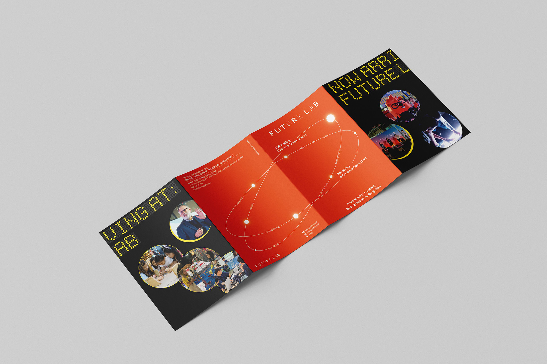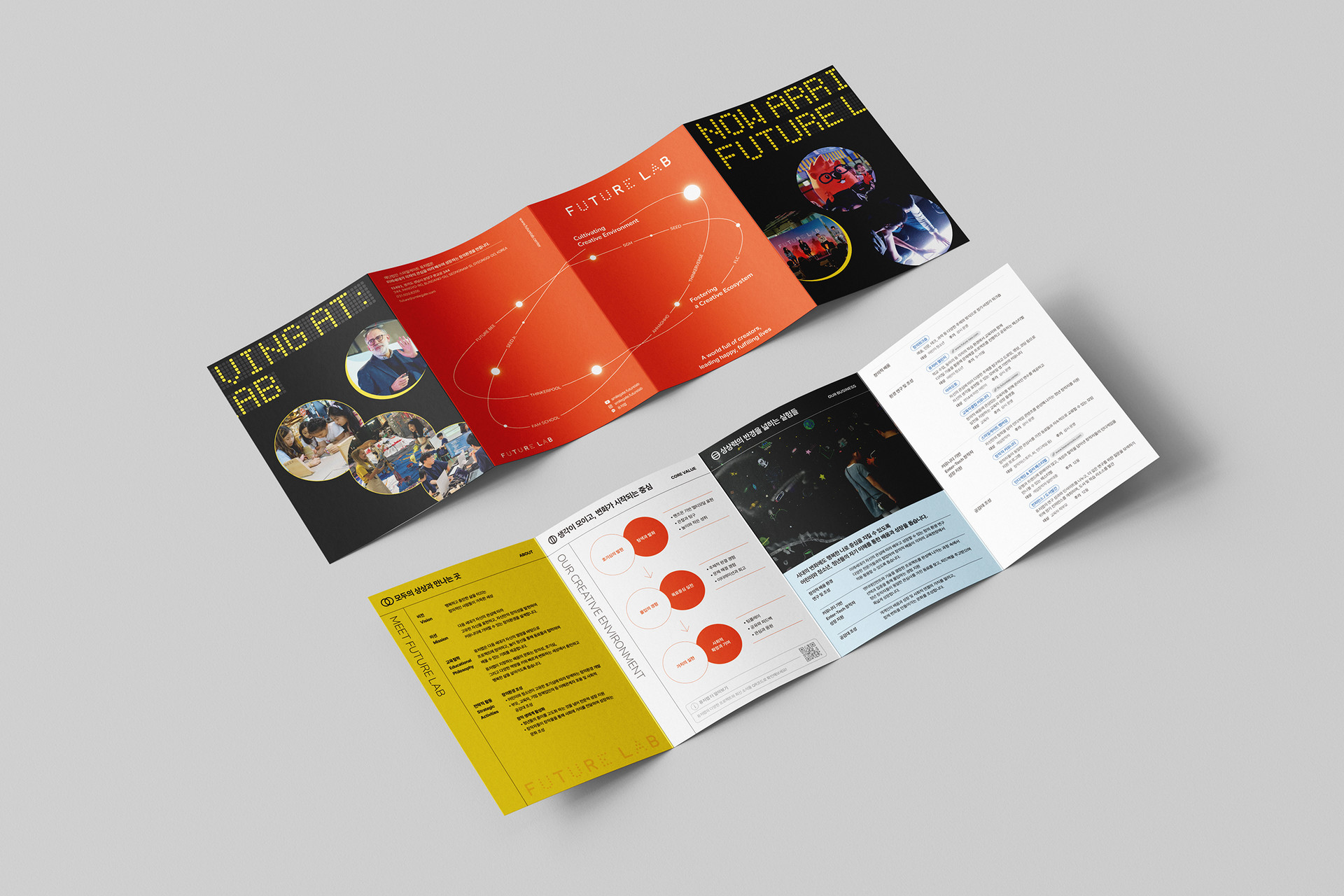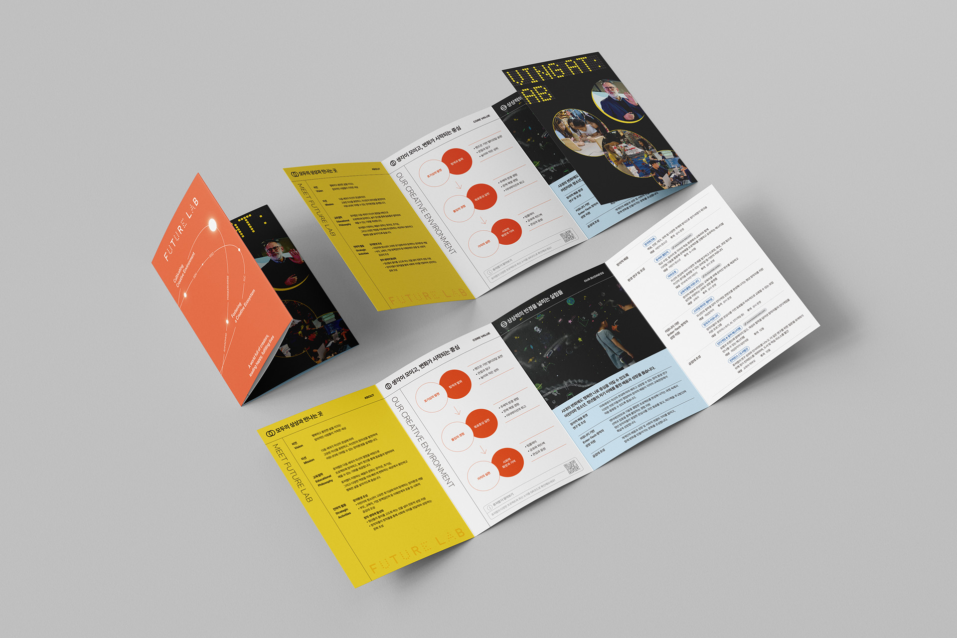 The orange/black/yellow palette with a clean sans serif system captures Future Lab’s energy and trust, while color-coded, density-tuned sections make values, programs, cases, and operations instantly scannable. Production was engineered for feasibility—8-page gatefold grid, fold/trim allowances, and anti-glare contrast for on-site distribution—while the key-visual system scales to posters, signage, and digital banners. More than a handout, the leaflet functions as a branded wayfinding of imagination, guiding audiences through Future Lab’s philosophy and offerings as one connected experience.