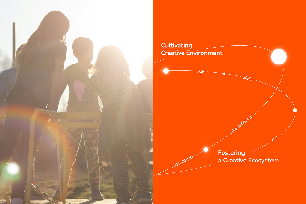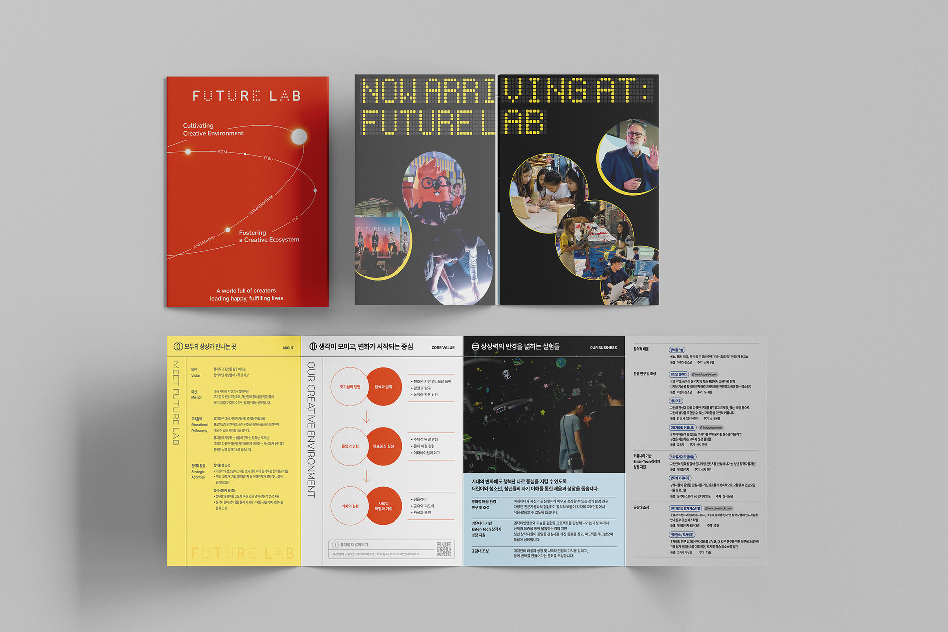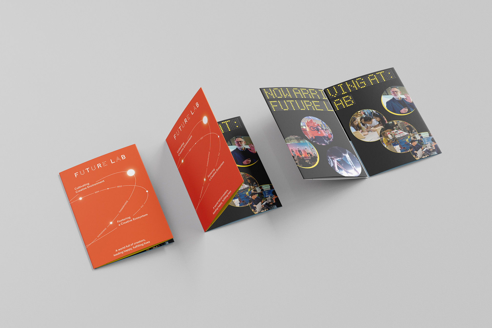 The orange/black/yellow palette with a clean sans serif system captures Future Lab’s energy and trust, while color-coded, density-tuned sections make values, programs, cases, and operations instantly scannable. Production was engineered for feasibility—8-page gatefold grid, fold/trim allowances, and anti-glare contrast for on-site distribution—while the key-visual system scales to posters, signage, and digital banners. More than a handout, the leaflet functions as a branded wayfinding of imagination, guiding audiences through Future Lab’s philosophy and offerings as one connected experience.