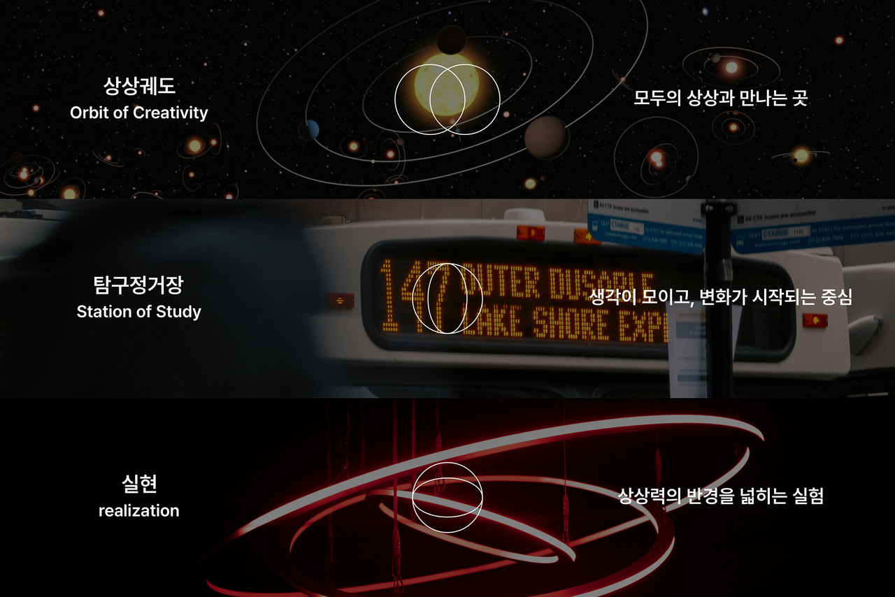 대문접지(게이트폴드)를 ‘닫힌 출입구가 열린 공간으로 전환되는 순간’으로 해석해, 리플렛 한 장이 출발점 → 열림 → 연결의 흐름을 체감하게 만들었습니다. 표지에서는 우주 궤도 모티프가 프로그램 간 관계를 한눈에 보여주고, 펼침과 동시에 내부의 원형 프레임 사진과 도트 매트릭스(Arrival Board) 타이포가 연쇄적으로 이어지며 ‘정거장—도킹’의 내러티브를 완성합니다.